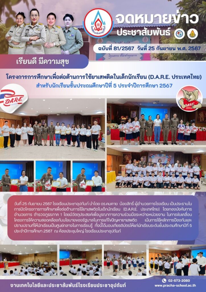 ฉ81 โครงการการศึกษาเพื่อต่อต้านการใช้ยาเสพติดในเด็กนักเรียน (D.A.R.E. ประเทศไทย) สำหรับนักเรียนชั้นประถมศึกษาปีที่ 5 ประจำปีการศึกษา 2567 Leave a Comment / จดหมายข่าว / By anusorn